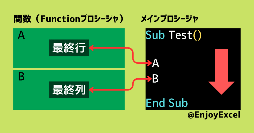 箱「A」では最終行、箱「B」では最終列を取得し値をメインプロシージャに返します。