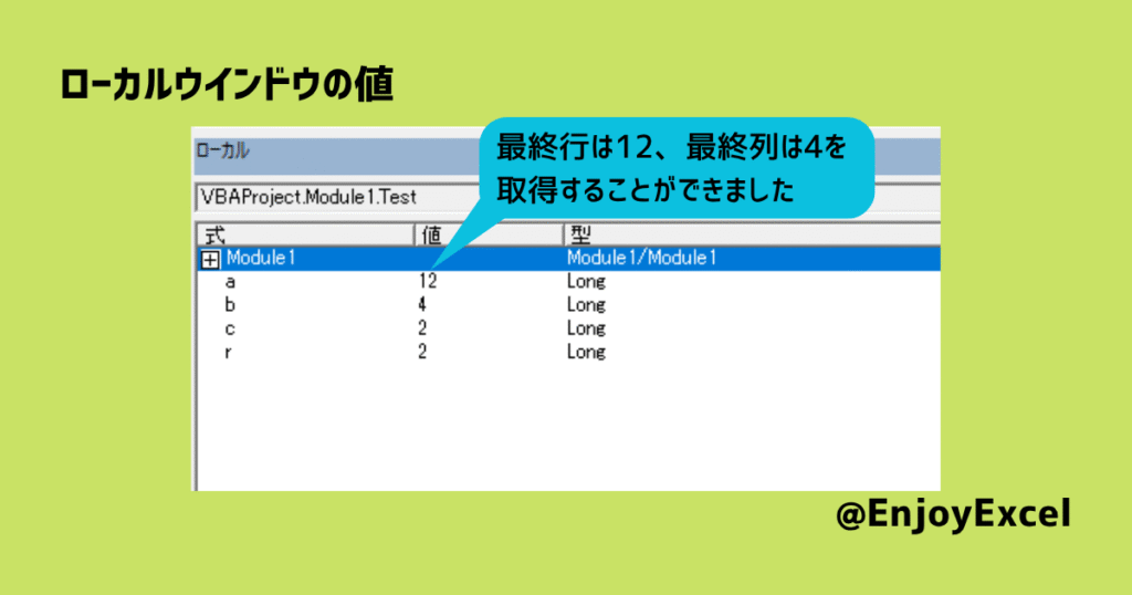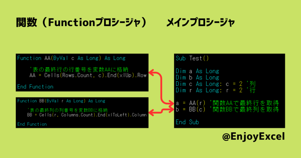 これでメインプロシージャでは最終行と最終列のコードを書かなくてもそれぞれの値を得る事ができます。